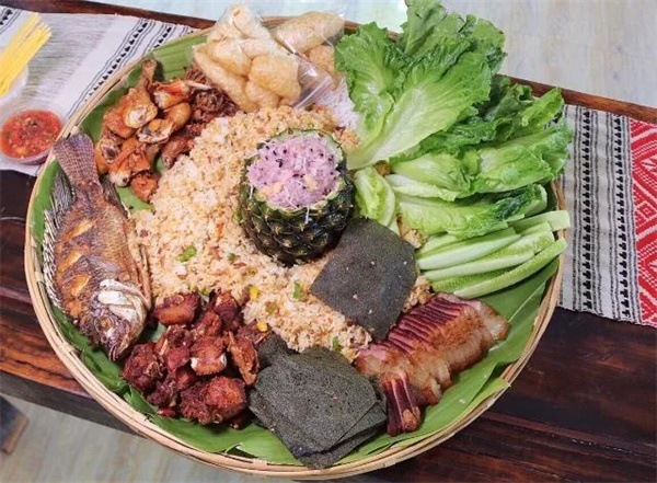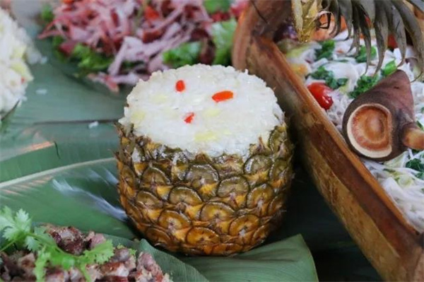 菠蘿和糯米更配!菠蘿飯是很多人提到西雙版納會在第一時間想起的一道美味,將菠蘿切丁與糯米充分混合后,便可以進行蒸煮。在菠蘿丁的搭配下,普通的糯米飯也變得酸甜可口。其中紫米菠蘿飯,不僅味道好,在紫色和黃色的視覺沖擊下,也讓整個菠蘿看上去讓人更有食欲。
