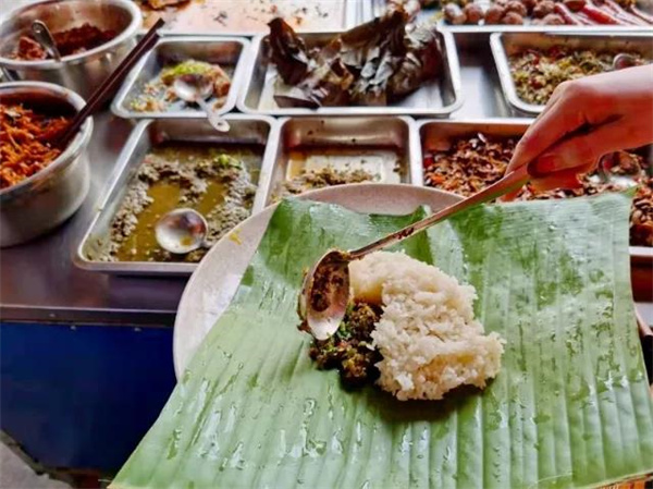 你還在糾結中午吃啥?大魚大肉吃膩了,來份糯米飯如何?西雙版納的糯米飯與其他地方的有所不同,光是配料就有十幾種,而且每個店家都有自己的搭配創意。除了必不可少的幾種咸菜外,其余的配菜可謂是豐富多樣,將糯米飯放到芭蕉葉上,加上具有傣族風味的涼拌雞絲,一份厚實的烤豬干巴,一塊分量十足的午餐肉,酸辣開胃的豇豆和小米辣酸筍,會吃的還可加一份螃蟹醬,一頓豪華版糯米飯作為午飯,真是又開胃,又頂飽,不一樣的特配更是讓人念念不忘。