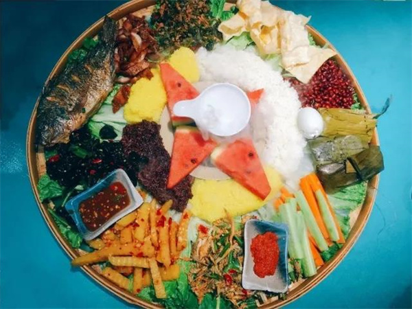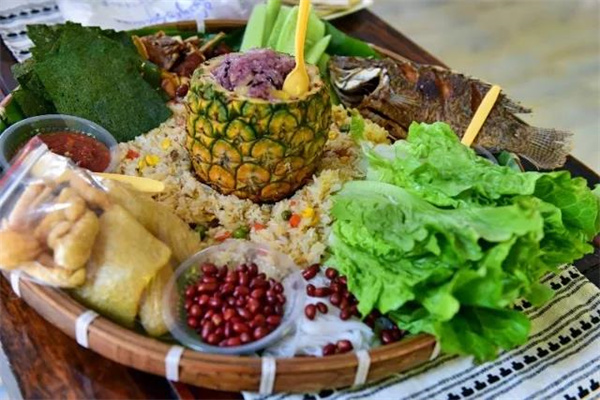 大筲箕上鋪上一層芭蕉葉,將傣族美食集合葷素搭配,加上食材染出的彩色糯米飯和水果,擺出各種精美的造型,用手抓著品嘗,整頓飯都吃得十分獨特。古樸美味的味蕾盛宴擺脫了傳統餐食的繁文縟節,用原始樸實的方式呈現在人們面前,頃刻間便能感受到突破桎梏的愉悅,與美味食材親密接觸,回歸質樸醇厚的飲食文化之中。