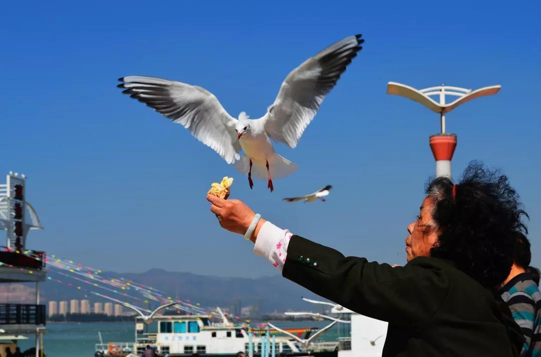 無論是走進翠湖還是海埂大壩,當看到無數只紅嘴鷗在藍天里盤旋、飛翔,你不妨買袋鷗糧喂喂它們,體驗一下海鷗從自己高高舉起的手中叼走鷗糧的那份親密感。