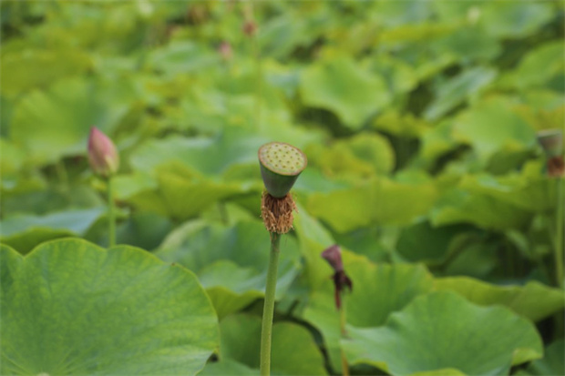 的脈絡。蜜蜂忙碌地在花心打轉,沾了一身金黃的花粉。荷葉此時也完全舒展,邊緣微微上卷,像無數綠色的小船浮在