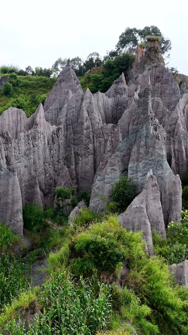 平潭子村的褐黑土林,三十畝壯闊如天工劈就,將小村溫柔環抱。這片土林形似 “干巴菌”,肌理粗獷而不失韻致,周邊