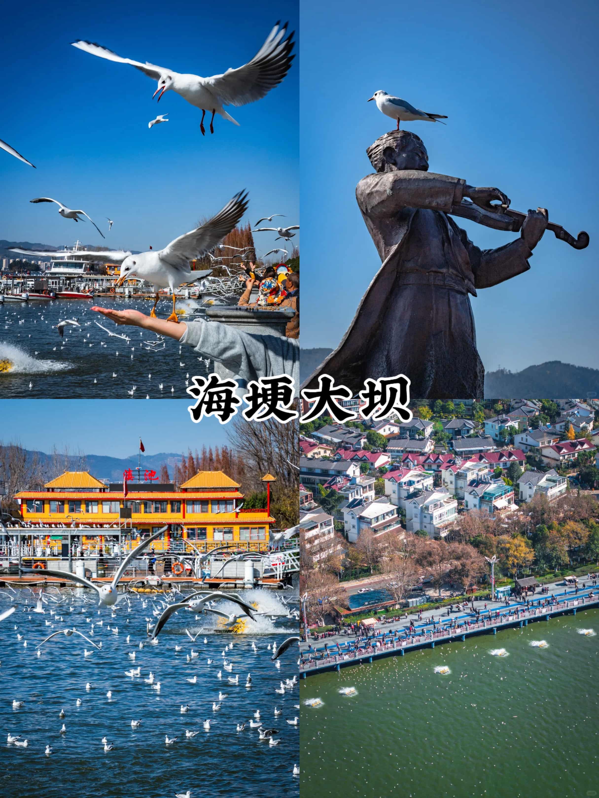 - 滇池海埂大壩:作為滇池的核心觀景點(diǎn),大壩長(zhǎng)約3公里,視野開闊。可租共享單車騎行,或步行至**海埂公園**,欣賞湖光山色。10月底的滇池碧波萬頃,偶見候鳥掠過,日落時(shí)分尤為壯美。大壩免費(fèi)開放,建議預(yù)留2小時(shí)。