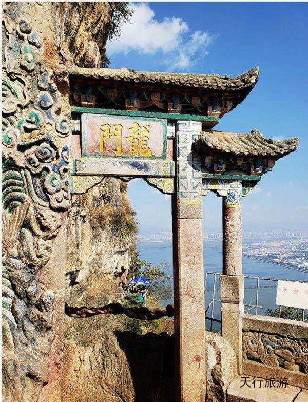 龍門石窟結(jié)構(gòu)布局優(yōu)美,刻工精細(xì),室內(nèi)的魁星、文昌、關(guān)圣皆就石巖鑿成,巧奪天工。登上龍門,在入口處有一圓柱石坊,上書“龍門”二字,并刻有“元寶”,據(jù)說能保佑人發(fā)財(cái)發(fā)達(dá),吉祥如意,所以游人都喜歡用手摸一下。入門有一石欄轉(zhuǎn)護(hù)的半圓形小月臺(tái),站在月臺(tái)眺望,人見上迎天風(fēng),下臨絕壁,五百里滇池?zé)煵ê泼欤普粝嘉怠?/span>