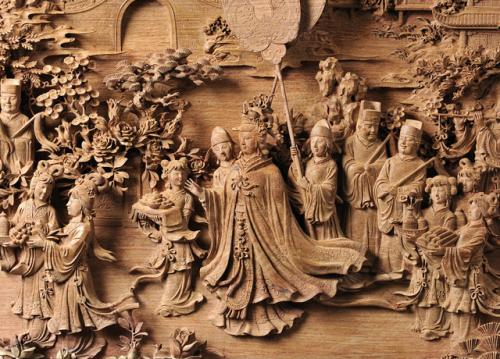 白族民居木雕畫:云南大理白族木雕是白族民居建筑中的重要組成部分。白族工匠巧妙地用木雕技藝進(jìn)行裝飾,使建筑在使用和觀賞上達(dá)到最大限度的融合。在不斷吸收漢族先進(jìn)的文化過(guò)程中,發(fā)展了具有鮮明特色的白族木雕工藝。