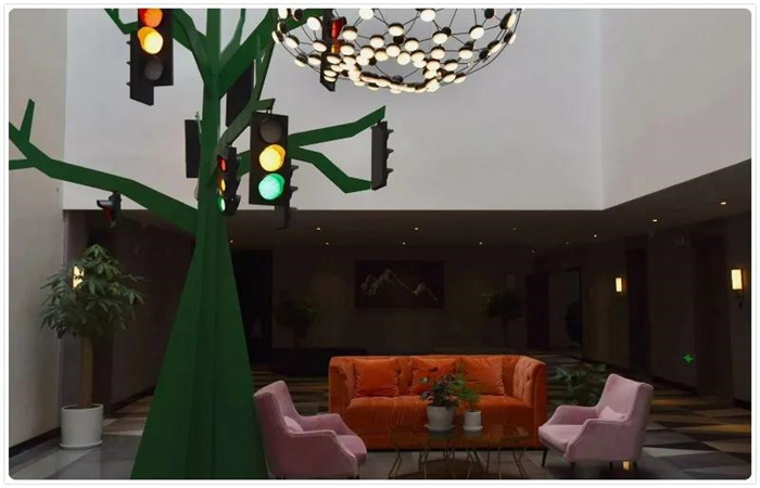 酒店中庭保留了大面積的采光玻璃頂,太陽光從天空傾瀉而下,為整個空間帶來時間和光影的變化。中庭的墻面用鐵軌和色彩斑瀾的各種小鳥來裝飾,以表現鐵路沿線美好的生態環境。酒店的二層有一棵安裝了火車信號燈的生命之樹,象征著客人和酒店越來越好的美好期待。三層有一個小小的火車站的候車點,輕輕坐下,仿佛在與歷史對話,實現一次時空的穿越。