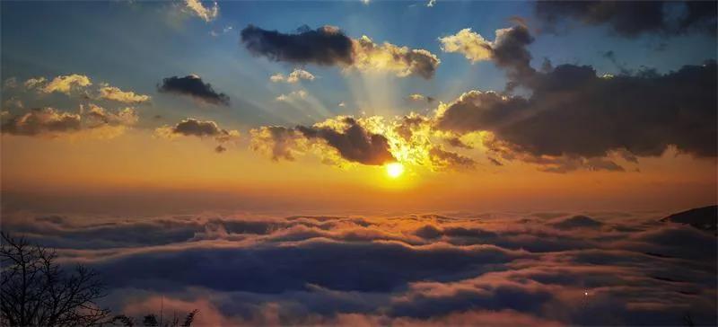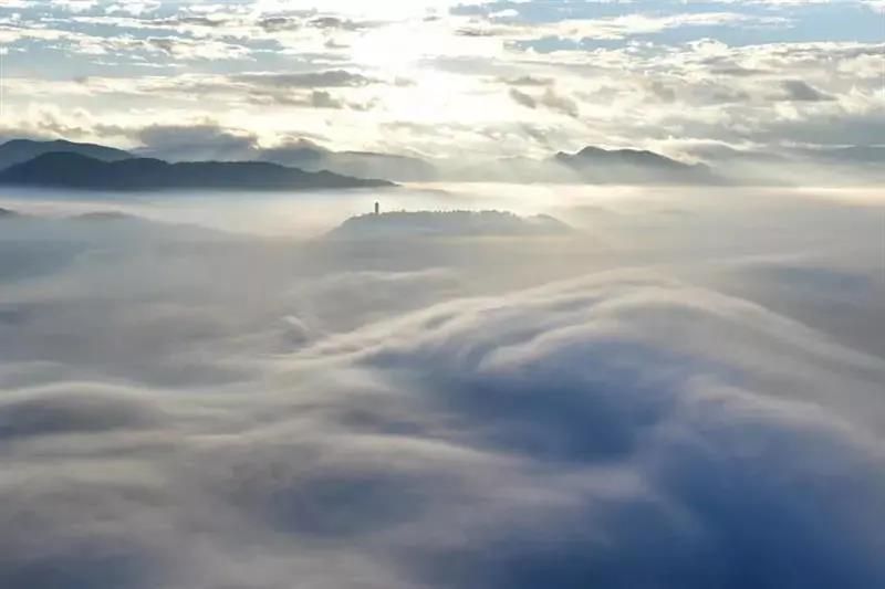 置身大蘆山的茫茫云海,如漫步云端,晨觀朝陽初升,暮賞落日紅霞,似有一只巧手執彩筆為遠處山嵐勾勒出一幅絕美圖景。云海漫涌,群山萬壑隱于云層之下,只有遠處的山巔隱約可見,如同天際的孤島,在白浪里沉浮翻騰。