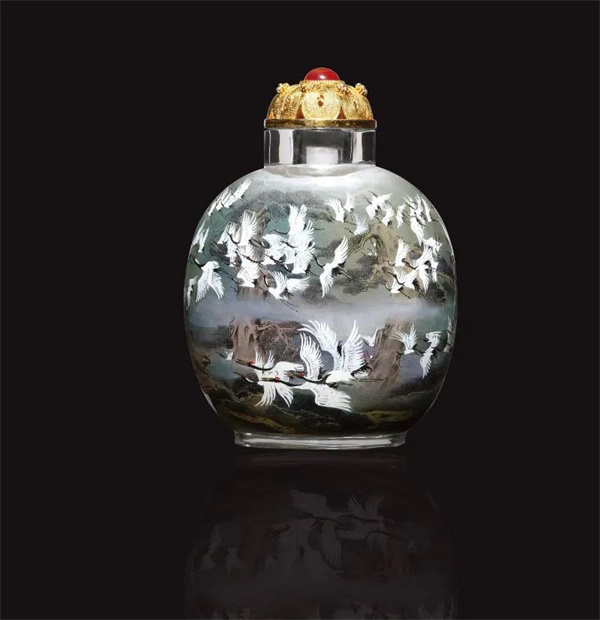其中,最引人注目的是《百鶴圖》,這也是她最滿意的作品。其主要依托于云南黑頸鶴,以及她對云南少數(shù)民族地域文化的熱愛。從構(gòu)圖到繪畫過程中,全是一氣呵成的,整個作品完成需要4個月。她通過內(nèi)畫技藝,將云南的山水盡收瓶中,綻放出奪目光彩。