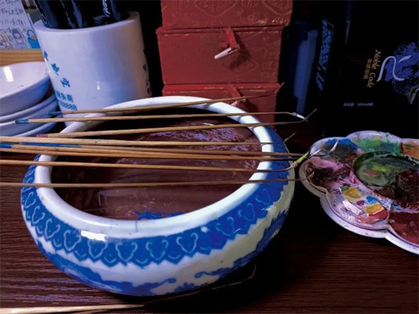 “要學(xué)內(nèi)畫,先得學(xué)做筆”這是孫鴻雁經(jīng)常對她的學(xué)生說的一句話。據(jù)了解,這個畫筆在傳統(tǒng)內(nèi)畫基礎(chǔ)上改革創(chuàng)新了幾次。傳統(tǒng)筆桿用的是鐵絲,而滇派內(nèi)畫選用的是金竹。新鮮的竹子曬一年半左右,可以保持一定水分又不會太干,彎曲后可以回到原處,如此作出的畫筆,無論從細(xì)度、弧度,還是韌性上,都更適合于在狹小的瓶內(nèi)空間創(chuàng)作,穿梭在狹窄的瓶口,游刃有余。